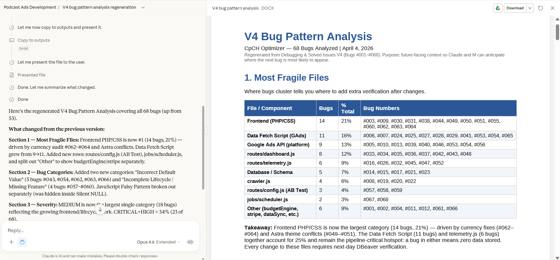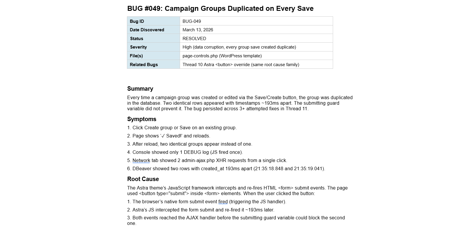 Die wertvollste Datei im ganzen Projekt. Jeder Bug wird dokumentiert — Root Cause, Evidenz, Fix, Verifikation. Zehn dokumentierte Bugs mit Prevention Rules bedeuten, dass derselbe Bug nie zweimal vorkommt. Die AI lernt aus eigenen Fehlern, aber nur, wenn du sie dokumentierst.