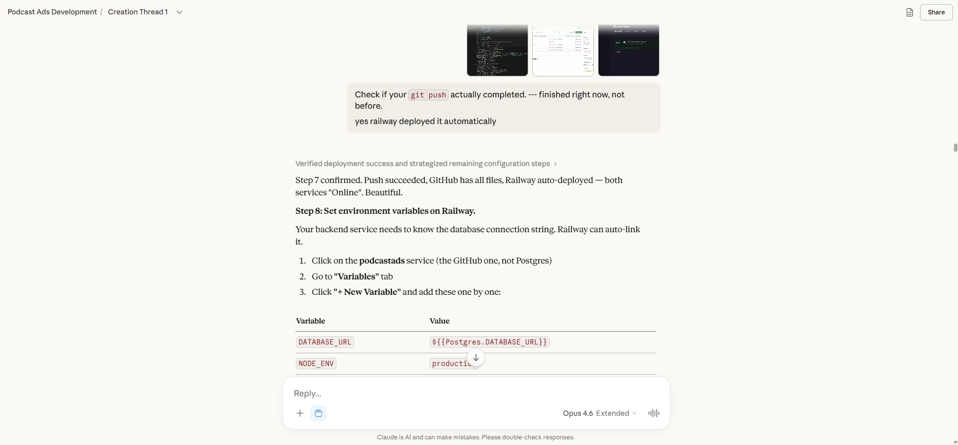 Mehrere Dateien gleichzeitig einspielen — die AI findet den Fehler. Manchmal lade ich vier Screenshots aus DBeaver, drei aus den Railway Logs und noch ein paar andere Dateien gleichzeitig hoch. 12 Files auf einmal. Die AI liest alles, versteht die Zusammenhänge zwischen Datenbank, Deploy und Code — und findet präzise die Stelle, an der es sich verhakt. Oft schneller als ich, weil sie alle Ebenen gleichzeitig sieht.
